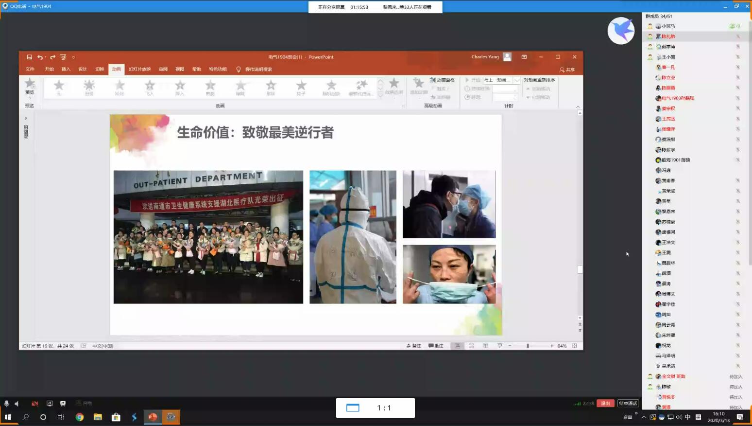 班会中,辅导员老师讲述了生命的本质在于它是在千翻磨难中产生的奇迹,所有的动物、植物和人类的生命都值得被尊重和珍惜,并且提出“有哪些时刻会让你突然感慨生活真美好”、“疫情结束后,你最想做的事是什么”、“你是否能够善待自己、接纳自己”这三个问题以供同学们深思和讨论,引导大家不仅要欣赏自己身上积极美好的部分,也需要接受自己的不完美,学会善待自己。随后,黄甫春、冯逸和王家璇三位同学分享了“最美逆行者”的事例和自己在疫情中的感悟,辅导员借用这些例子鼓励同学们在珍爱生命的同时,明确自己作为当代大学生的责任与担当,对此提出四点要求:停课不停学,不放松对知识的追求;做谣言粉碎机,积极传递正能量;关注自己及和家人的心理健康,用爱化解焦虑;保护环境,多做公益,实现生命的价值。