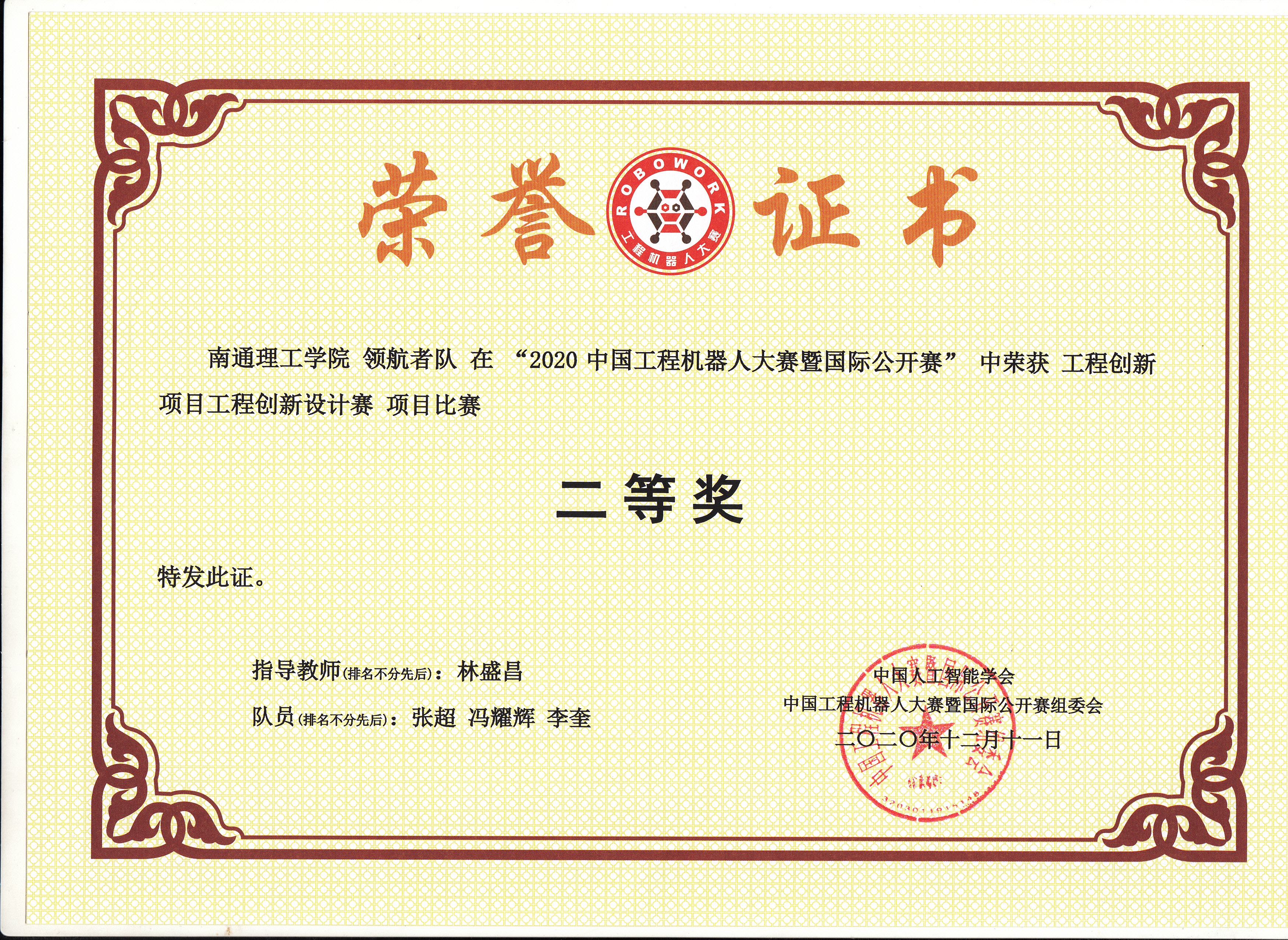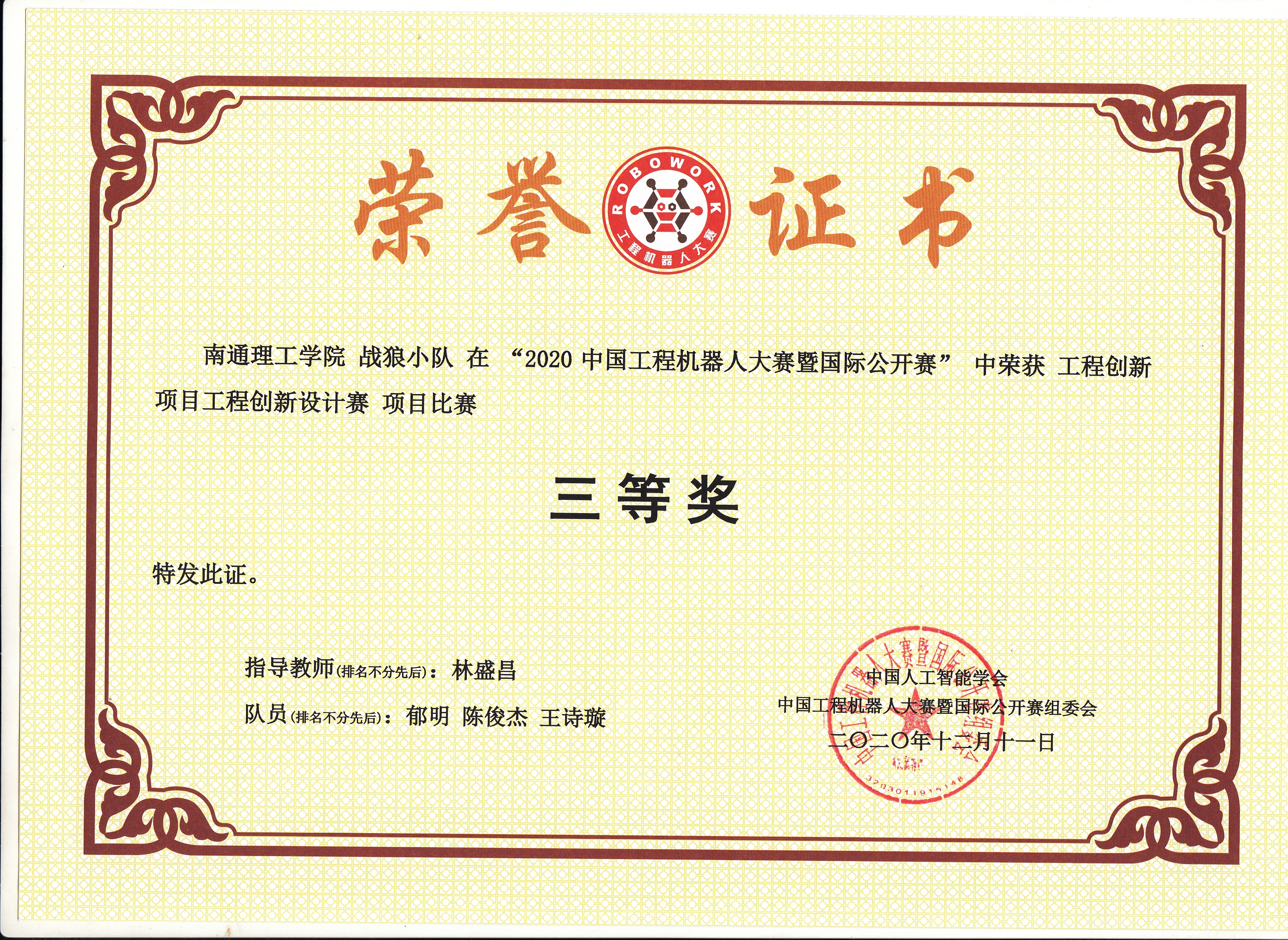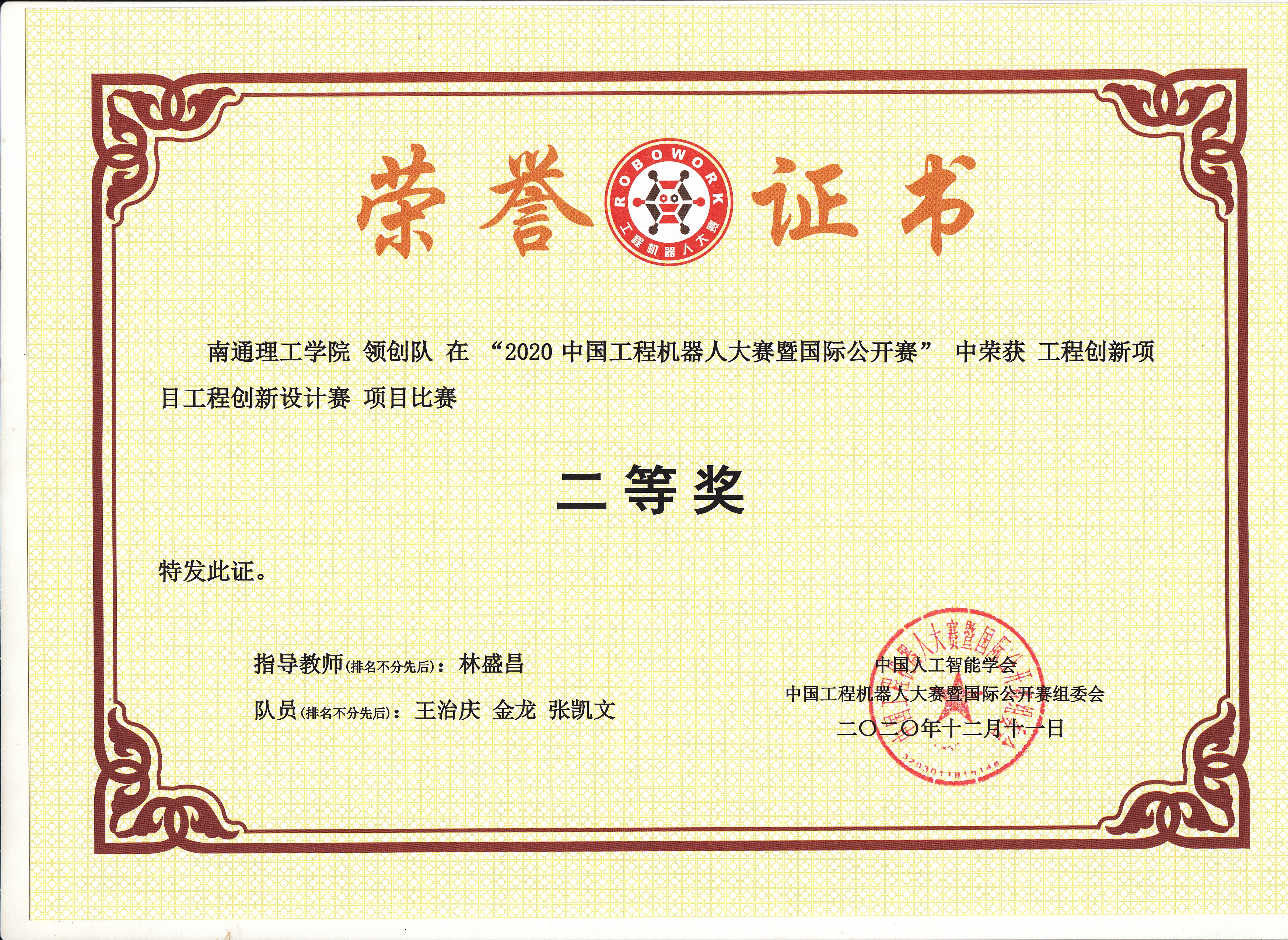 由中国人工智能学会主办、中国工程机器人大赛暨国际公开赛组委会承办,2020年10月1日-10月15日线上提交技术报告,包括作品加工、制作、组装、调试的全过程视频。紫琅工控团队在林盛昌老师的指导下,最终选出李志刚、李奎、王嘉辉、张超、郁明、冯耀辉、胡文峰、王昊、王治庆、金龙、张凯文、陈俊杰、王诗璇十三名成员组成5支参赛伍。经专家历时一个月的评审,最终获二等奖3项,三等奖2项的好成绩。