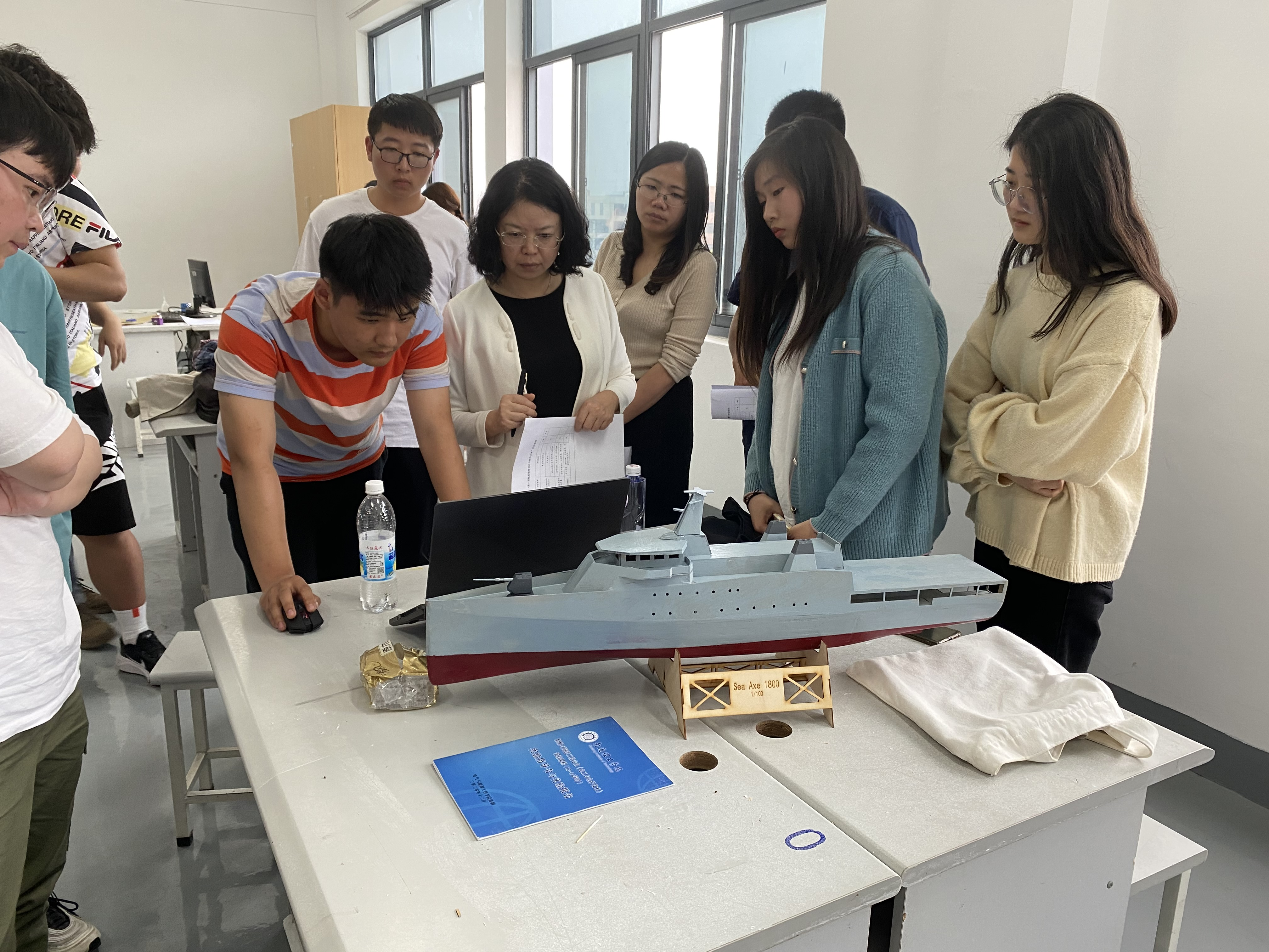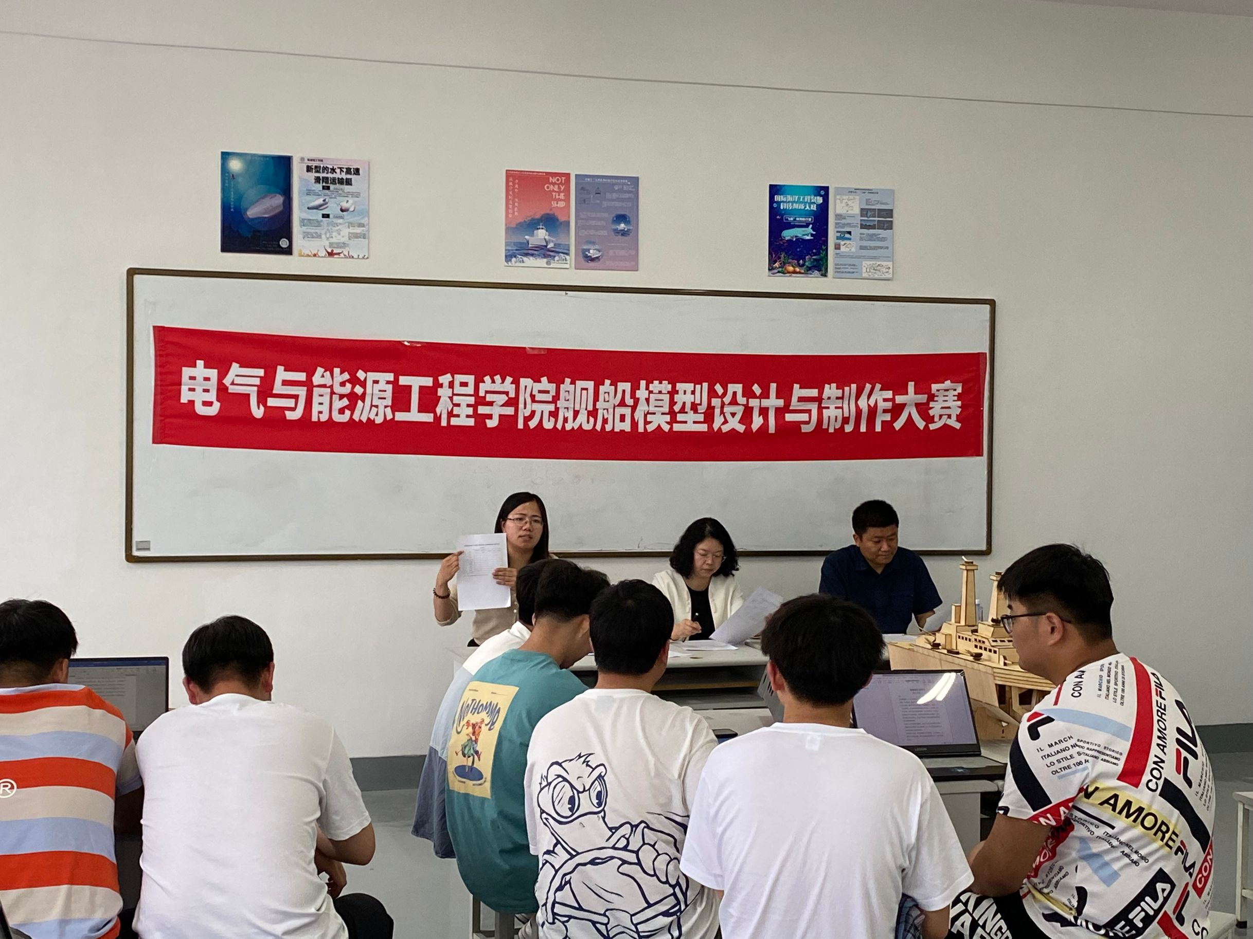 为充分响应“培养创新型海洋人才,积极推动海洋科技进步”的号召,以崇尚科学、实践求知、锐意创新、面向海洋、服务国防为宗旨,5月11日,由我院主办,船舶教研室承办的首届舰船模型设计与制作大赛于电气楼406顺利开展。本次决赛共有11支队伍入围,历经一个多月,11支队伍均顺利完成了舰船模型作品。比赛形式采用舰船模型的静态方式展出,由裁判组对参赛模型进行验看,审阅模型图纸和说明材料,并进行现场答辩。