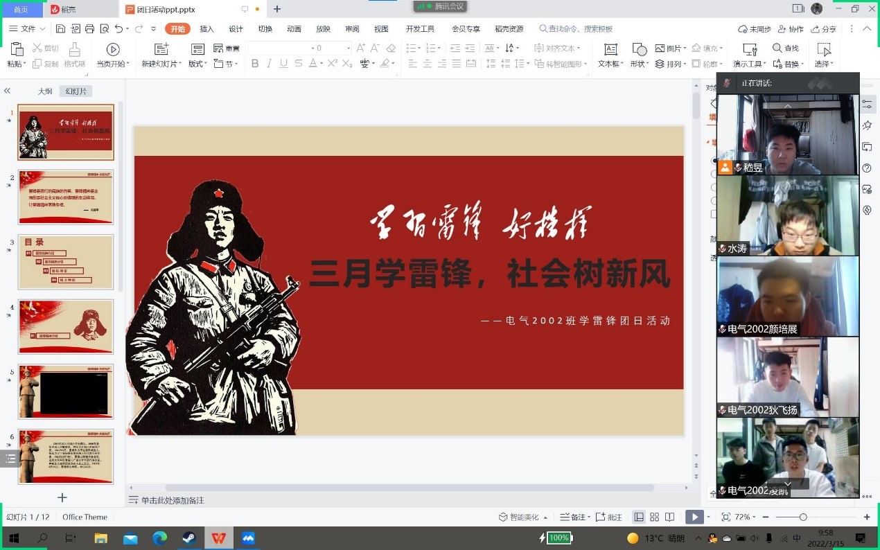 各团支部通过播放《雷锋》系列视频、PPT展示、拜读雷锋日记等方式向同学们介绍雷锋的先进事迹,从而让同学们深刻体会到雷锋先人后己、全心全意为人民服务的美好品质。在活动中,同学们踊跃发言,气氛活跃。其中,电气2101班团支书指出,作为新时代的大学生,应该向雷锋同志学习,学习他的精神品格,并将他的精神宣扬传承,最后能像雷锋同志一样拥有“钉子”般的精神。20级电信专业团支部的同学们积极分享了身边的雷锋故事,并展开热烈讨论,大家纷纷表示今后会继续以饱满的热情投入到学雷锋行列中。