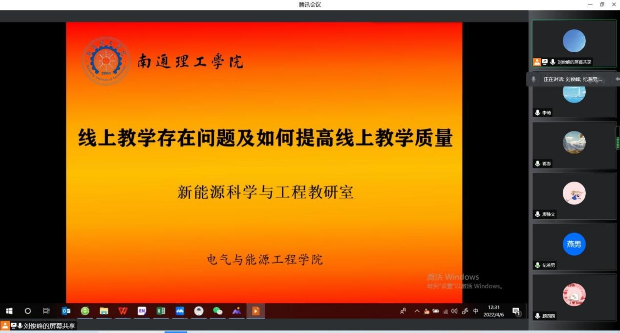 4月6日,我院新能源科学与工程教研室在线上开展了关于“线上教学存在问题及如何提高线上教学质量”的交流研讨会,教研室全体教师参加了会议。