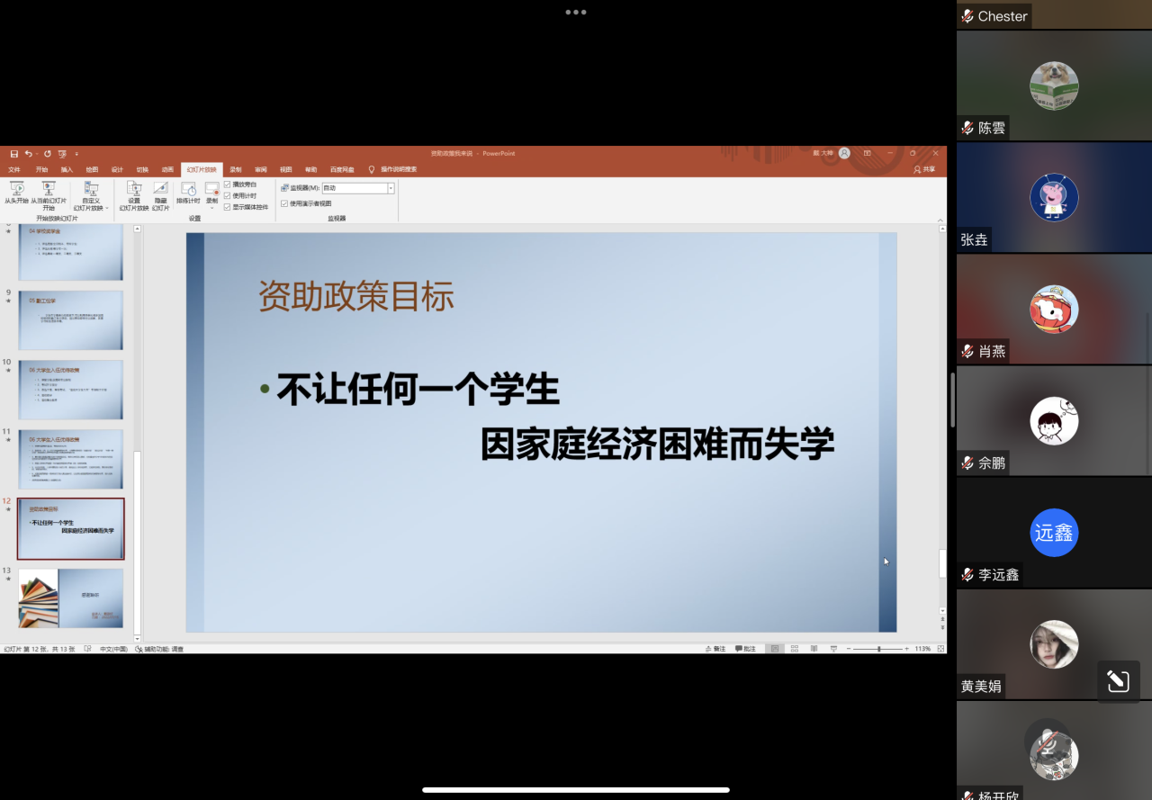 为了让同学们更加了解国家的助学贷款、国家助学金和奖学金的政策,让同学们用自己的方式讲解每一项的资助内容,并以具体事例进行解释说明,让同学们实实在在的体会到国家资助政策给同学们带来的喜悦感、满足感和幸福感,自动化1901班于07月15日上午开展“资助政策我来说”的主题班会。本次班会由班长戴敬轩主持,采用线上的会议方式进行。