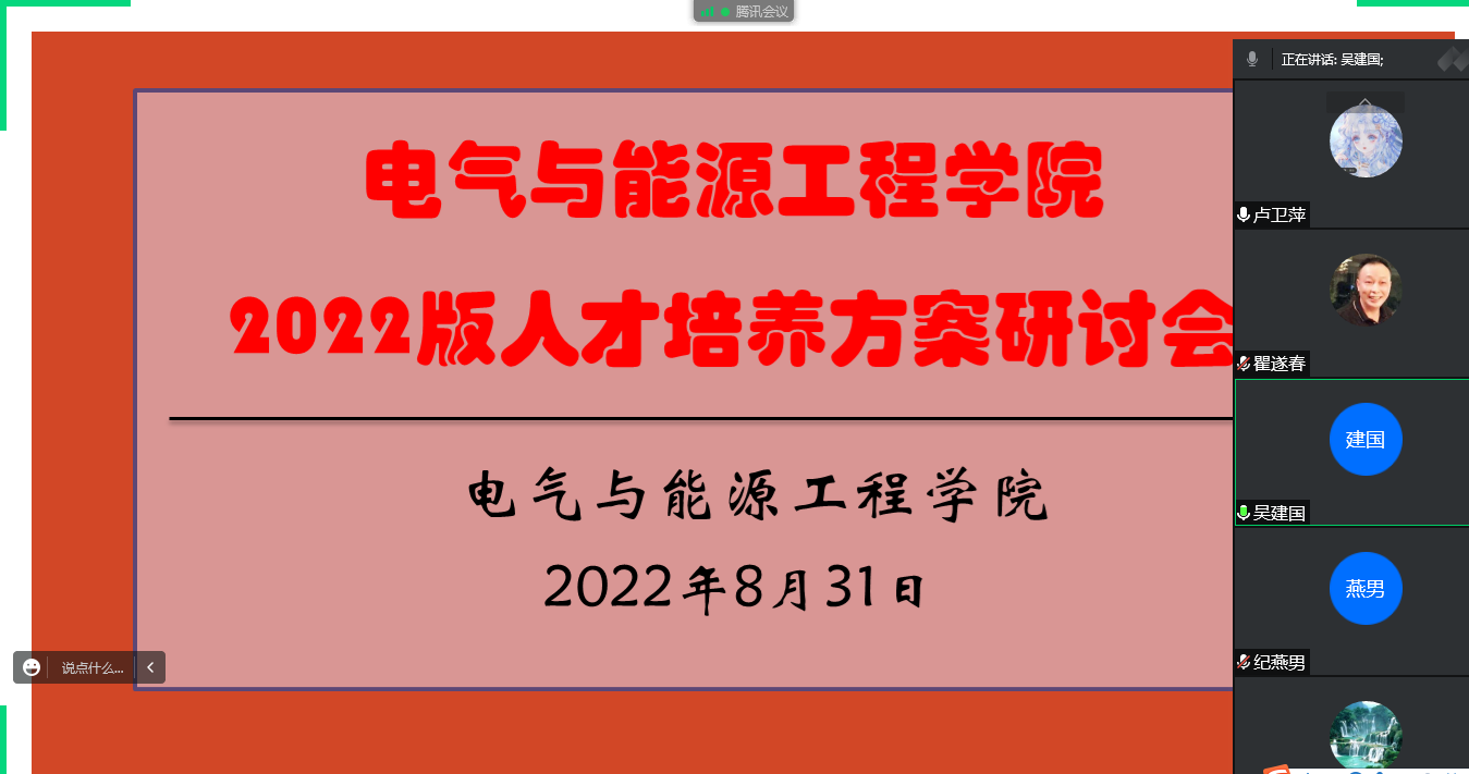 8月31日下午,电气与能源工程学院采用线上线下相结合的方式召开了2022版人才培养方案研讨会。本次会议由院长吴建国主持,副院长卢卫萍、电气教研室主任瞿遂春、自动化教研室主任高洁、电子信息教研室主任王青、船舶教研室主任陈玲、新能源教研室主任纪燕男参加。