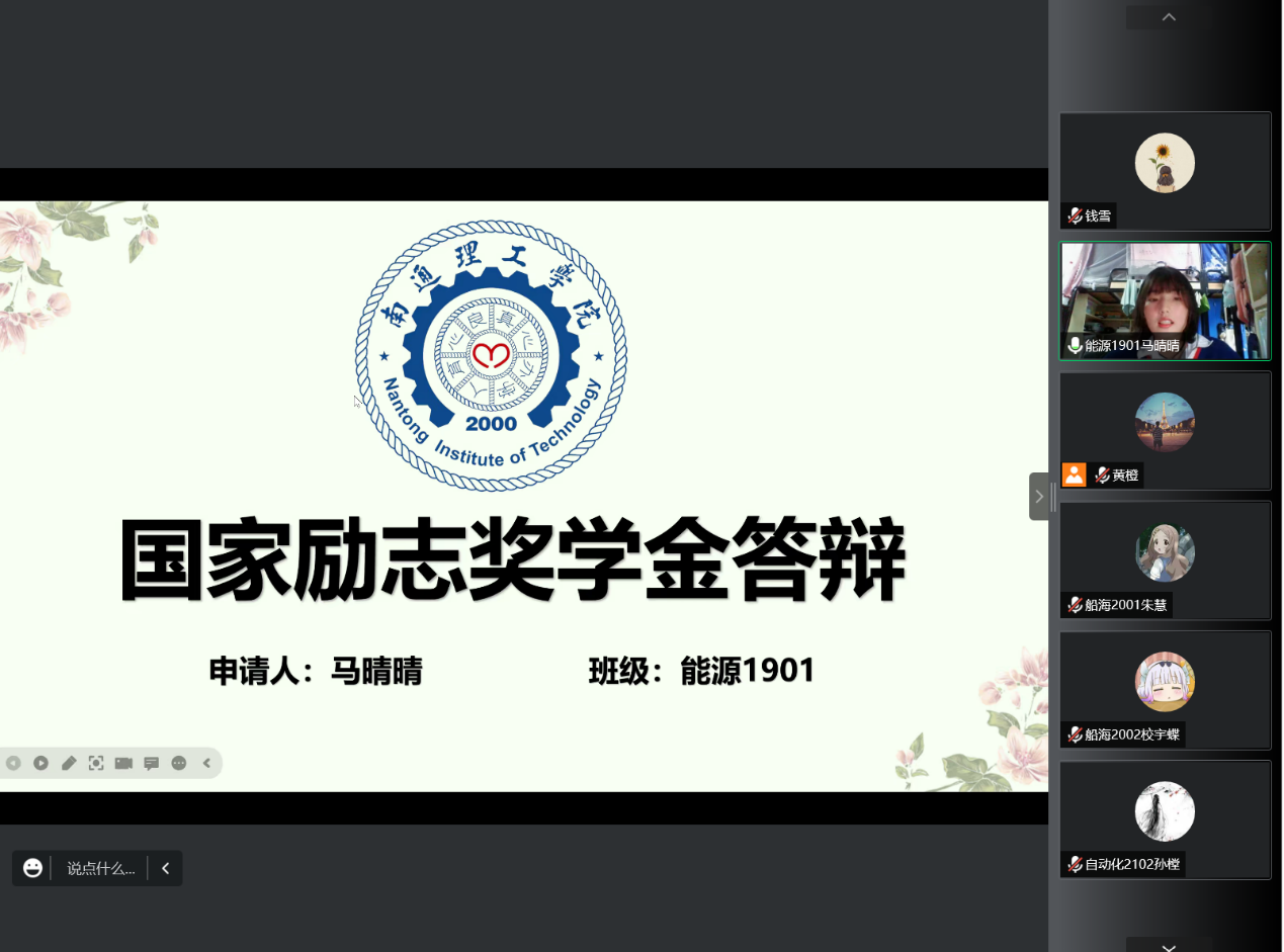 为进一步规范我院国家励志奖学金评选工作,体现我院国家励志奖学金评定的公平、公正、公开性,展示我院受资助大学生的精神风貌,10月20日下午,电气与能源工程学院召开国家励志奖学金线上答辩会。参加本次答辩会的评委有分团委副书记黄橙及各年级辅导员老师。