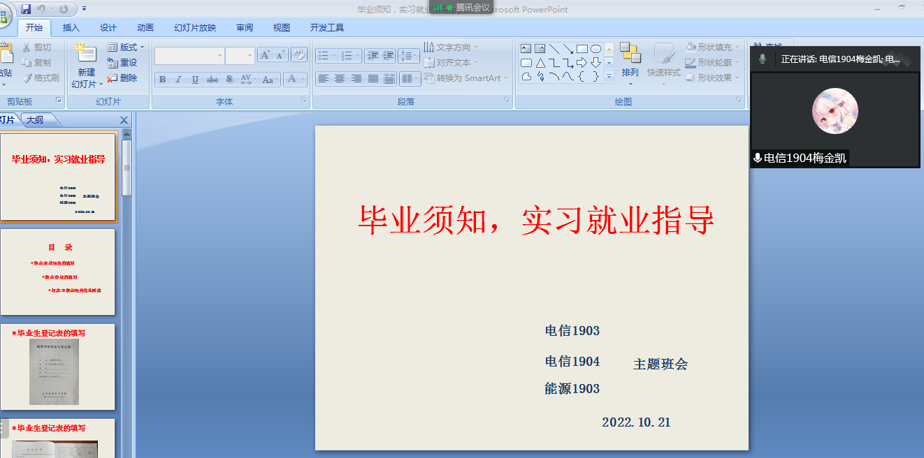 此次主题班会各班辅导员通过线上、线下方式,围绕就业形势、择业心态、求职能力提升、实习就业要求、就业材料注意事项、安全教育等方面开展主题教育。通过主题班会活动,引导同学们端正就业心态,树立正确的就业观和择业观,正确认识自我,以就业为目标,提升求职能力,积极落实实习就业单位,注重实习就业安全,激励同学们在实习就业单位努力提高技能素质和心理素质,增强自身的竞争优势。