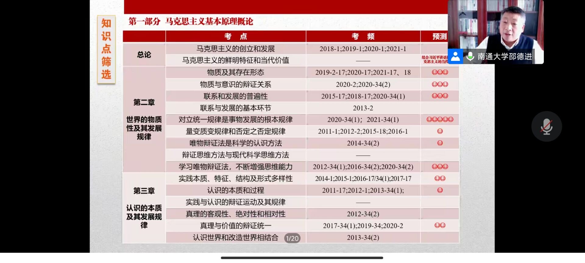 随后,邵德进教授进行了考研政治命题预测。从《马克思主义基本原理》、《毛泽东思想和中国特色理论体系概论》、《中国近现代史纲要》、《思想道德修养与法律基础》四门思政课程进行预测。从分值比例、试题类型、重点难点、方法技巧等方面,进行了精辟分析和深入讲解。