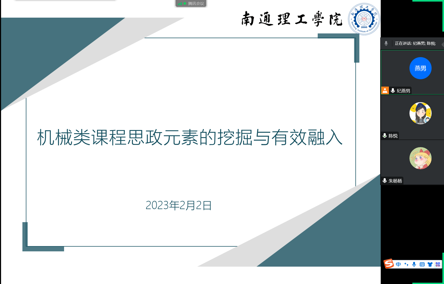 2月2日,我院召开了机械类课程群线上研讨会。本次研讨会由课程群负责人纪燕男老师主持,朱杨杨老师和陈悦老师参加。会议围绕机械类课程如何进行课程思政元素的挖掘与有效融入进行了讨论。