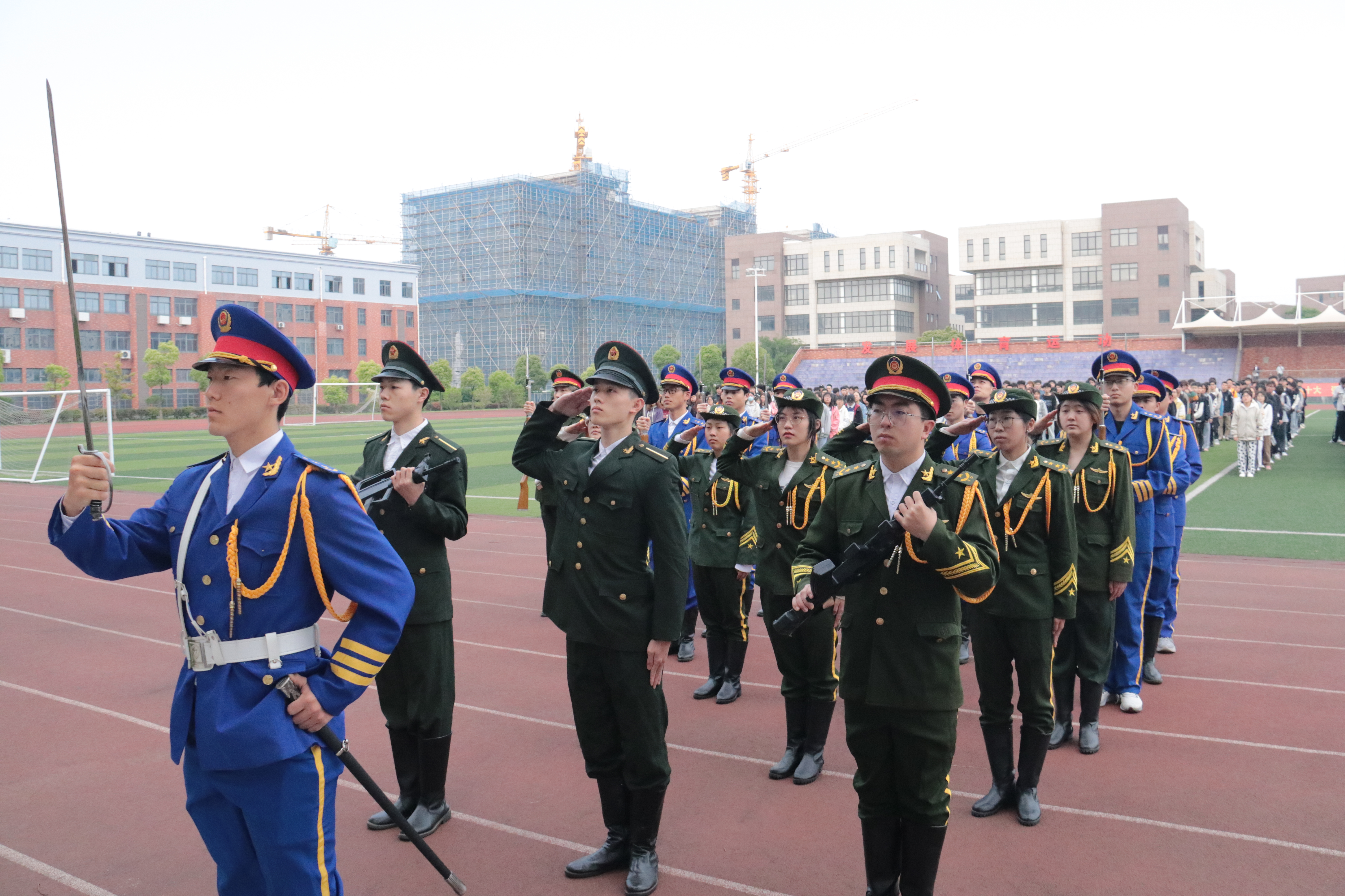 活动伊始,英姿飒爽、气宇轩昂的国旗护卫队队员们迈着铿锵的步伐来到国旗台下,全场一片肃静。在激昂的《义勇军进行曲》中,升旗手振臂一挥,鲜艳的五星红旗徐徐展开,在初升的阳光映照下、全院师生的注目中,迎着朝阳,在晨曦中缓缓升高。