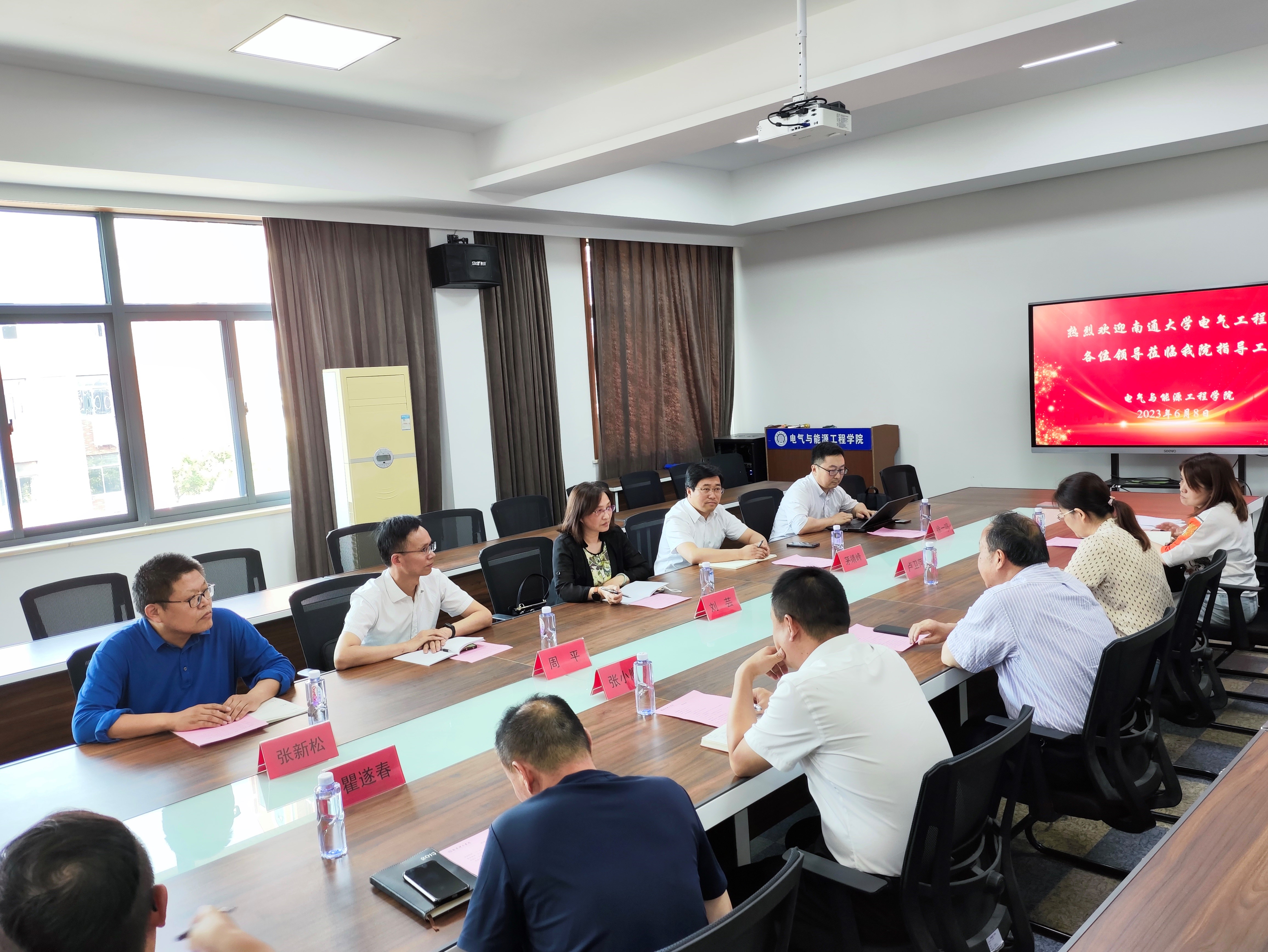 6月8日下午,南通大学电气工程学院领导班子全体成员,党委书记刘芸、院长茅靖峰、党委副书记兼副院长周平、副院长徐一鸣、副院长张新松一行到我校电气与能源工程学院交流指导工作。电气与能源工程学院院长吴建国、党总支副书记兼副院长张小顺、副院长卢卫萍以及各专业教师参加交流活动。会议由吴建国院长主持。