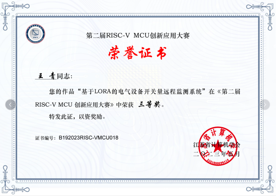 近日,由江苏省计算机学会主办,苏州大学协办的第二届RISC-V MCU创新应用大赛落下帷幕,我校电子信息工程专业王青老师的参赛作品“基于LORA的电气设备开关量远程监测系统”获得三等奖。