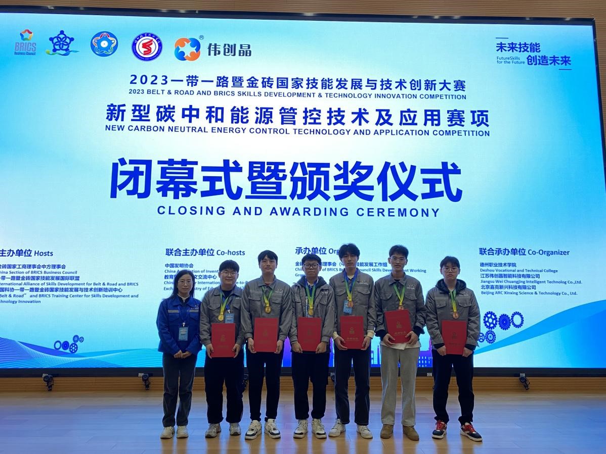 2023年11月27日下午,2023一带一路暨金砖国家技能发展与技术创新大赛之新型碳中和能源管控技术及应用赛项全国总决赛在德州职业技术学院隆重开幕。我校由张嘉诚、菅水星和李委三名同学组成的南通理工学院一队荣获一等奖,由徐凯雄、徐泽帅和汪晨宇三名同学组成的南通理工学院二队荣获三等奖。