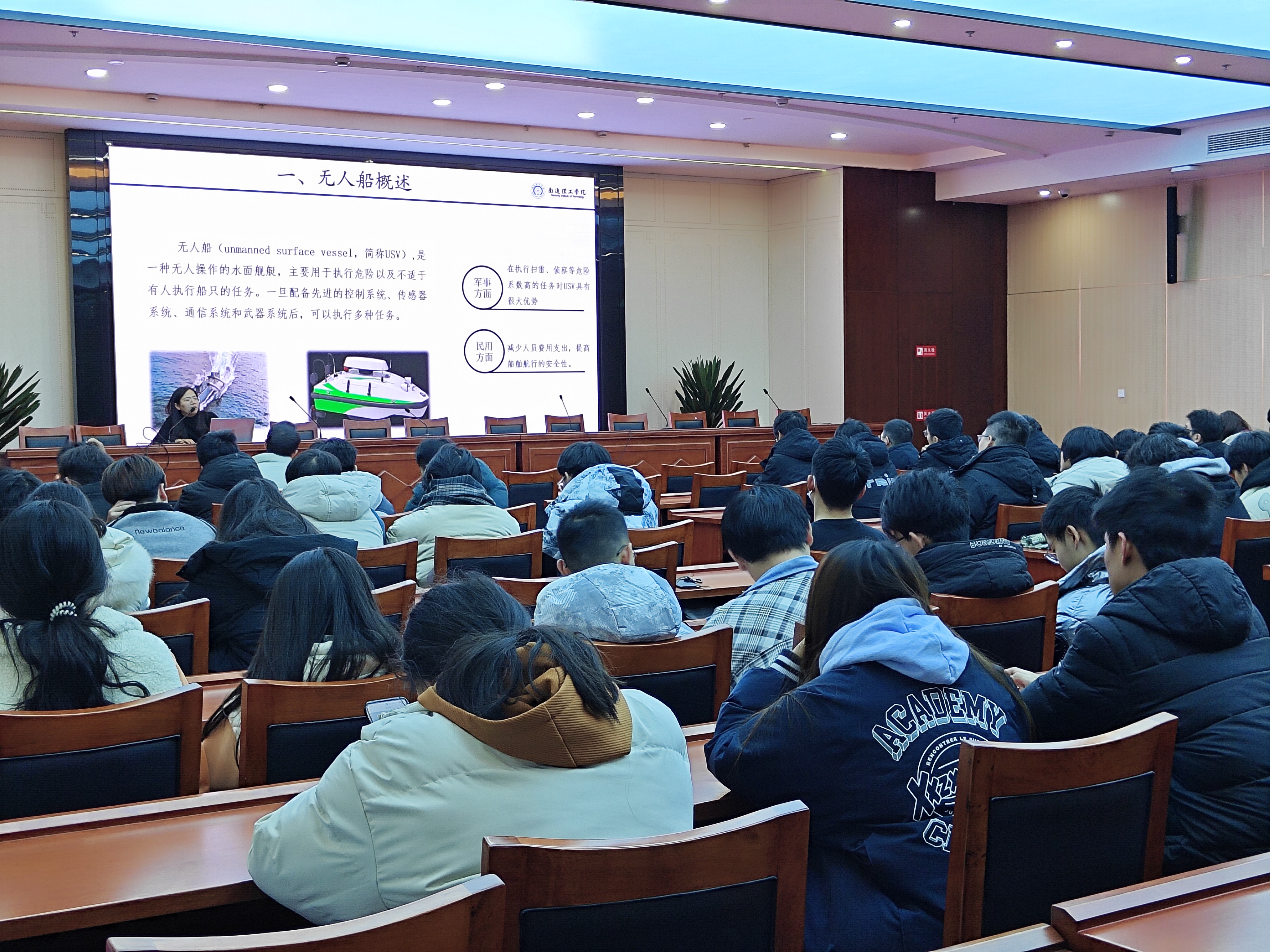 为增强学院的学术氛围,电气与能源工程学院覆盖全院所有专业为学生开展系列讲座。12月20日晚,船舶教研室主任陈玲老师在图书馆五楼天南厅为船舶与海洋工程专业、船舶电子电气工程专业学生开展《无人船技术及其应用分析》讲座。