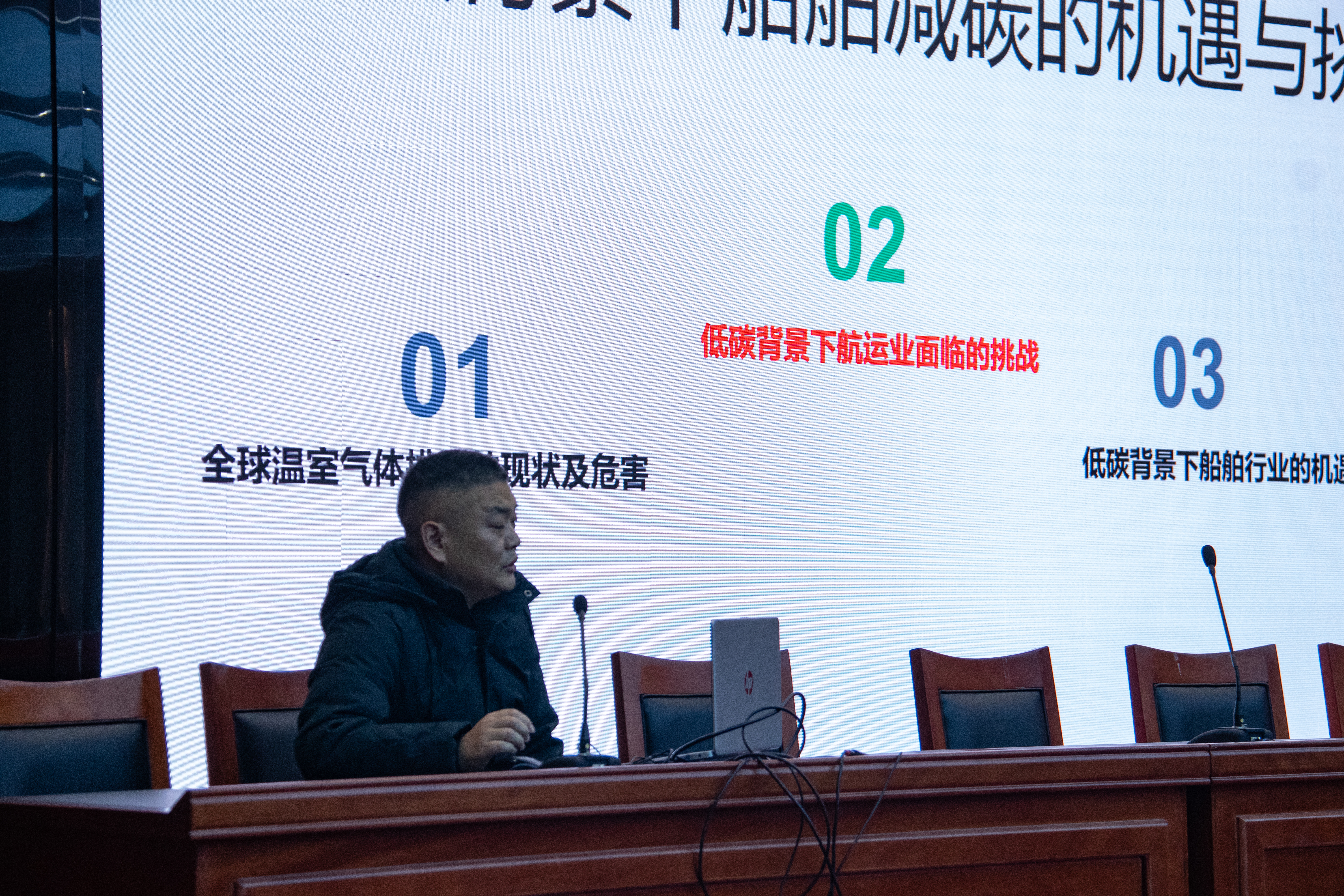 郑金伟老师分别从航运业碳排放的现状、船舶行业减碳所面临的挑战以及行业发展趋势及机遇等方面进行讲述。船舶作为温室气体排放大户,环境污染问题日益受到国际社会的高度关注。规制船舶环境污染相关规划文件相继出台,标准日益严苛给传统石化燃料船舶带来巨大挑战。同时航运绿色低碳趋势已成为船业发展的重要切机。
