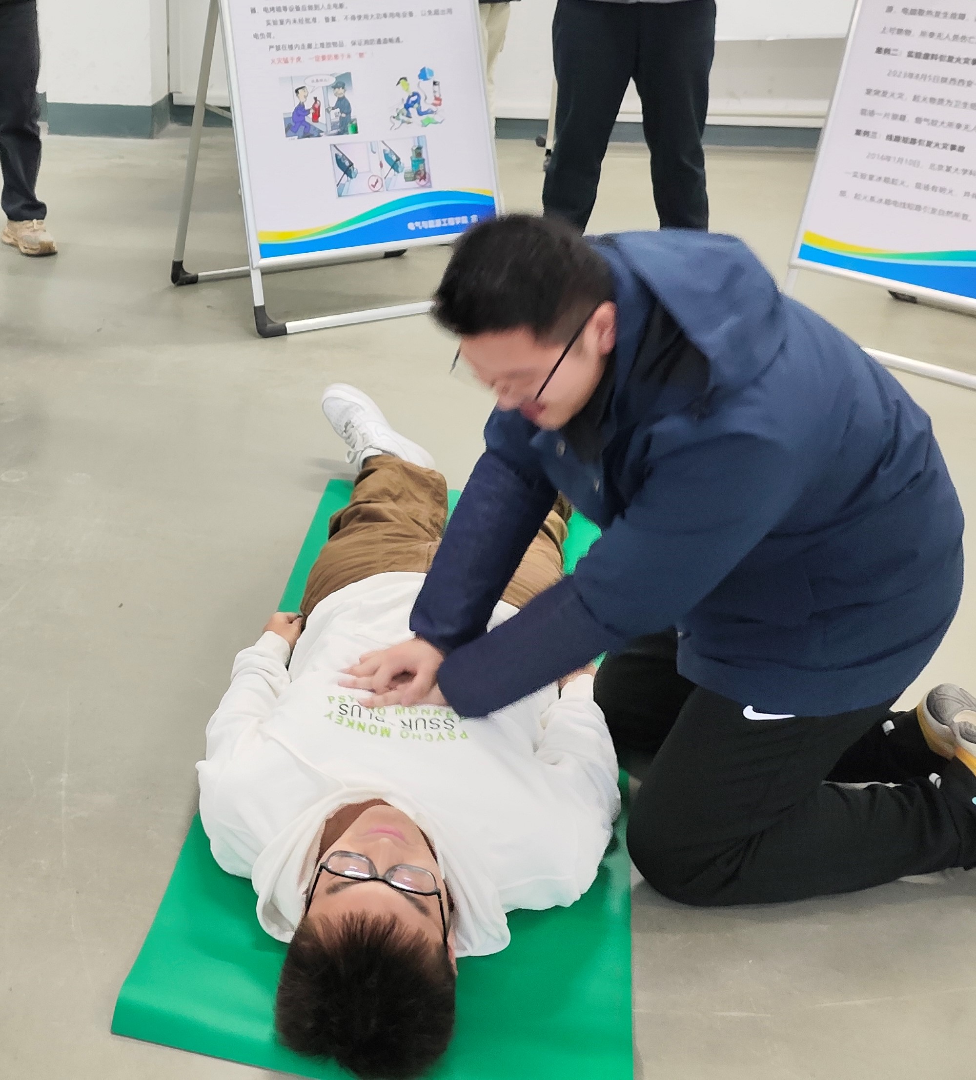 首先,对在场人员进行了心肺复苏操作讲解和培训,随后根据学院精心制定的应急演练方案,演练模拟了实验时发生的严重触电事故。在事故发生后,指导老师迅速响应,第一时间进行了安全断电和脱离电源的专业处理,并严格按照预案流程逐级上报。得益于前期组织的急救培训,师生们利用所学知识进行急救处理,触电事故得到了及时、迅速且妥善的处置。