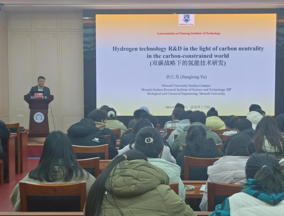 3月19日,蒙纳士大学苏州校区副校长余江龙教授应邀莅临我校,围绕 “双碳战略下的氢能技术研发” 作专题学术报告。电气与能源工程学院院长、副院长卢卫萍及百余名师生代表出席活动。