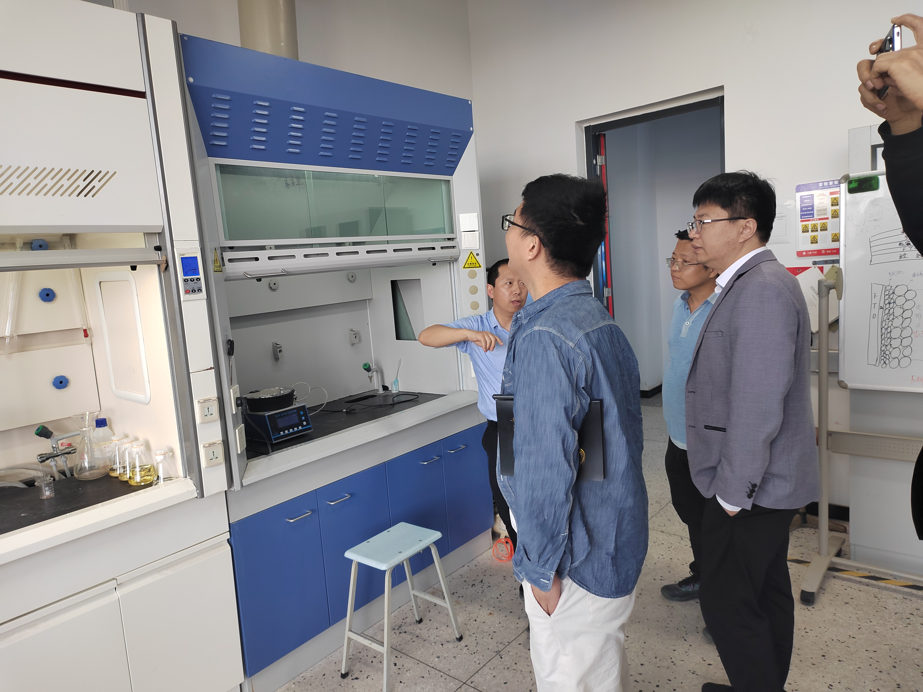 调研团队在苏州工学院电子信息工程学院副院长韩志达教授、张磊副教授和吴大军老师的陪同下,参观了光伏材料制备、光伏器件制造、封装测试和系统应用实验室。在参观过程中,韩志达副院长详细介绍了“材料 — 器件 — 测试 — 系统” 的实验教学项目流程,让调研团队对我校光伏电池实验室的教学体系有了更全面的认识。同时,调研团队对我校实验室建设拟购入的设备,如手套箱、霍尔效应测试系统、IV 测试系统、紫外可见分光光度计、傅里叶红外光谱仪等进行了实地查看,并就设备的型号、参数等技术细节与韩志达副院长进行了深入交流。