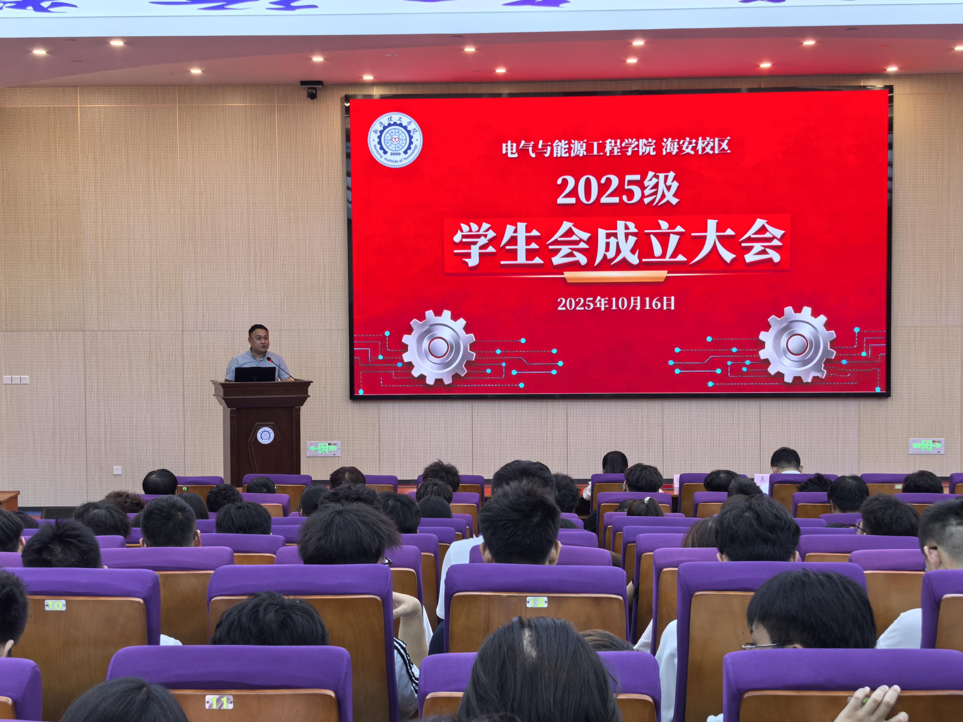 10月16日晚,电气与能源工程学院海安校区 2025 级学生会成立大会在大学生活动中心小礼堂隆重举行。学院党总支副书记、副院长张小顺,院分团委副书记陈蓓蓓,辅导员方园玉、吴浩出席大会,2025 级全体学生参会。大会由院分团委副书记陈蓓蓓主持,旨在搭建学生自我管理、自我服务的平台,为学院学生工作注入新活力。