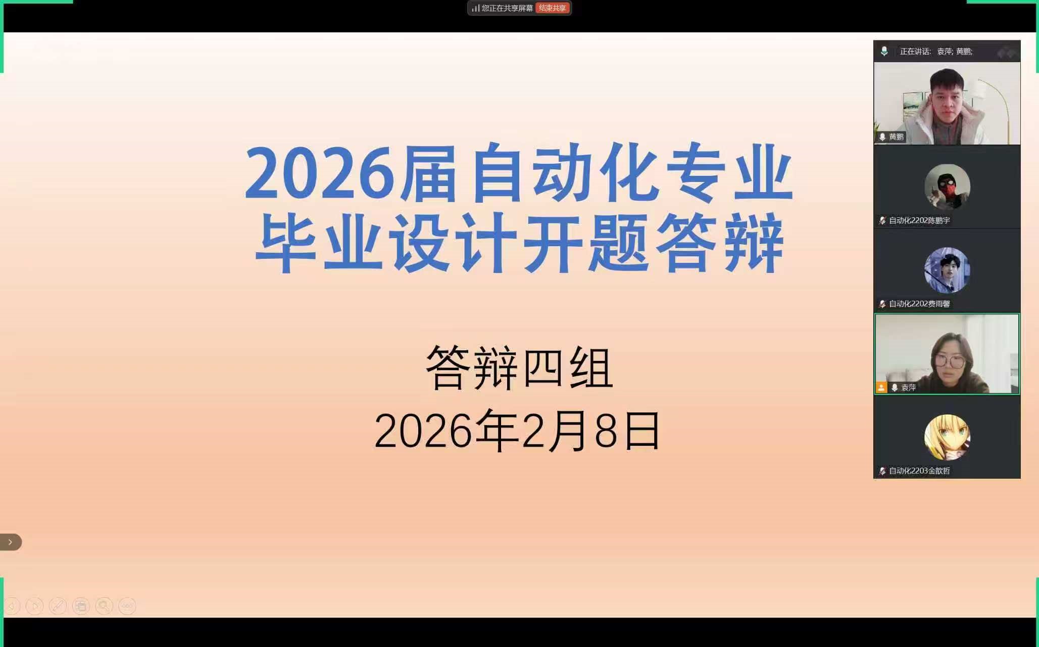 为规范毕业设计流程、严格把控选题质量、切实提升人才培养成效,2026年2月8日,自动化专业2026届毕业设计开题答辩第四组通过线上形式顺利举行。本组答辩由高丙坤教授担任组长,袁萍、黄鹏老师担任答辩委员,对28名学生的开题报告进行了集中评审与指导。